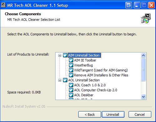 It currently prompts you to pick the uninstallation and removal of any of the following "non-critical" AOL or AIM installed programs: