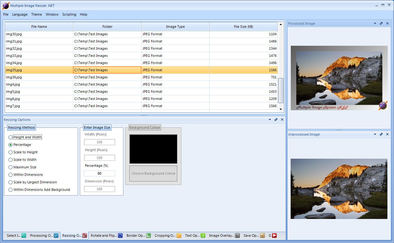 Multiple Image Resizer .NET is a batch image processor. The software was originally designed and built to batch resize images but now features a wider range of batch image processing functionality.