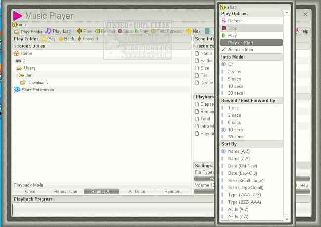 Music Player features dual play systems allowing you to play a folder and a list. It also has native M3U playlist support (copy, paste, open, save, build). It also supports drag 'n dropping of music files to play/add to a playlist. There are multiple play modes included; Once, Repeat One, Repeat All, All Once, and Random, giving you control over your playback. Additionally, there is Intro Mode, which allows you to play the first 1-30 seconds of a song.