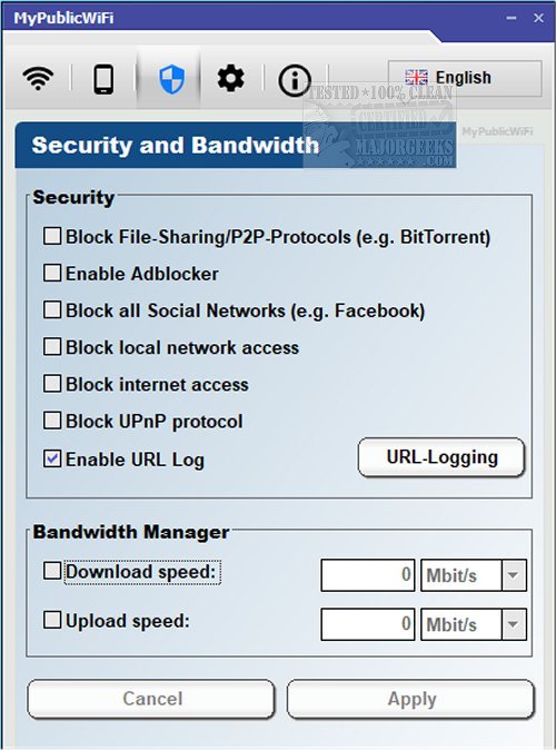 There are two other tabs to look at it. The first is the Clients tab, which can show you details of who connected. The second is the management tab, which is your settings. You can change languages, block file sharing, enable or disable URL logging and start with Windows.