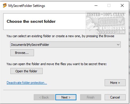 By default, the folder is named MySecretFolder within your Documents folder. However, you can choose a different confidential folder by clicking the Browse button. It's important to note that nearly any folder can be designated as secret, except removable or network drives, as well as system folders utilized by the Windows operating system. If you attempt to protect an unsuitable folder, the MySecretFolder software will provide a warning prompt to advise against doing so.