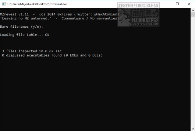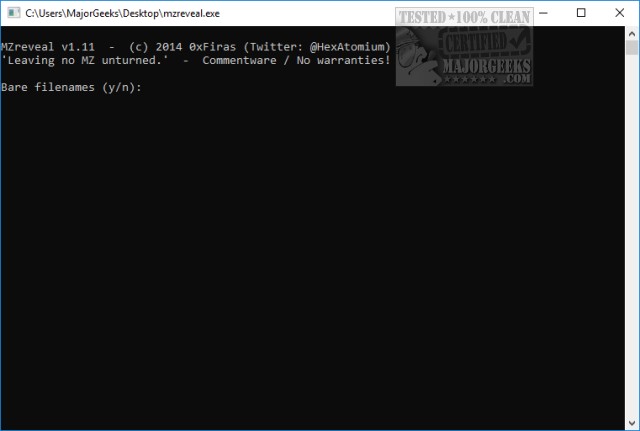 MZreveal can be run as-is and will immediately scan any executables or DLL's in the folder you ran it from. You are given the option to include bare file names or not with a simple Y or N choice.