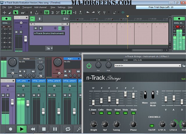 It can record or playback an unlimited number of audio and MIDI tracks. The effects can be tracked with built-in effects including Reverb, AutoVol, Echo, Pitch Shift, Chorus and Track EQ, etc. n-Track also supports third-party DirectX and VST plug-ins.