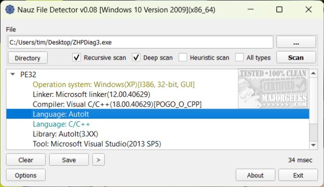 Nauz File Detector is small and uses very little memory. You can browse to open any file or folder when you run the app. After selecting a file, you will automatically see any available information, including linker, compiler, language, library, and tool.