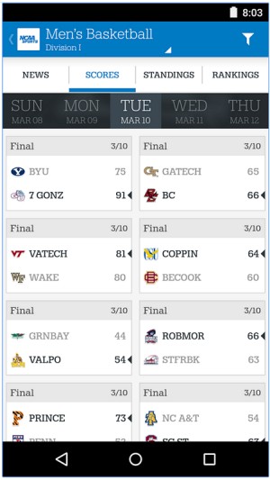 NCAA Sports for Android allows you to easily download and start by picking your favorite schools to follow for quick access to school content and custom scoring alerts.