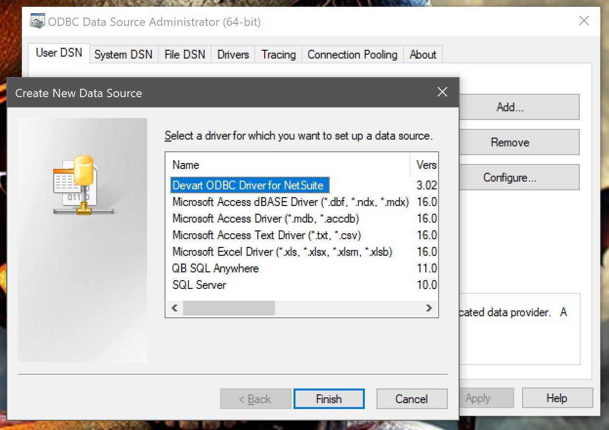 Select the NetSuite ODBC Driver: In the list of drivers, select Devart ODBC Driver for NetSuite and click Finish.