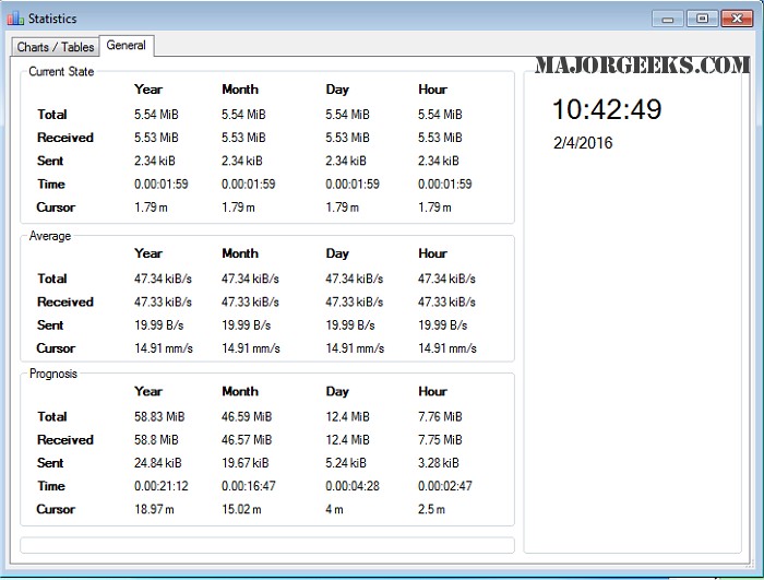 NetTraffic also features a graph and numeric values in real-time, a taskbar icon showing activity, a statistical module, computer work time, and predictions based on collected data. You can also review any archival data compiled.