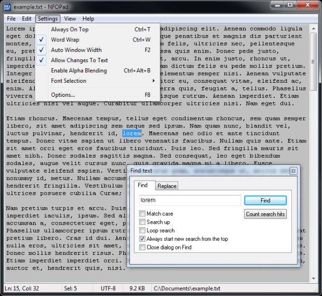 While there are many NFO readers, don't be fooled by the name - this does have the advantage of being an excellent text editor should you need one with the occasional ability to read NFO files that many others lack. It's easy enough to use but has many features available, including word wrap, alpha blending, font selection, search and replace, shell integration, printing, and more.