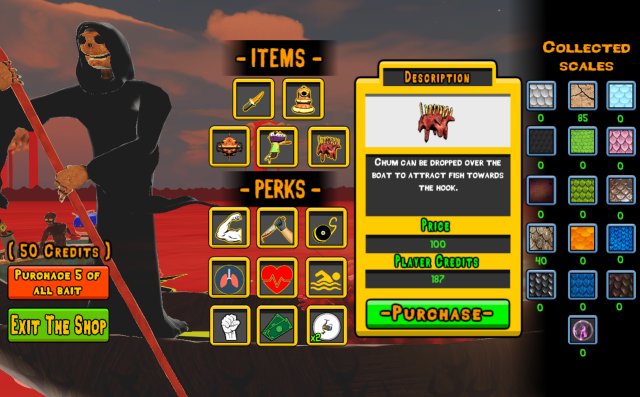 You can upgrade Health, Lung Capacity, Reel Speed, Grip, and more to get better and make the game easier to win. Learn the crafting formulas and collect the scales by battling fish.