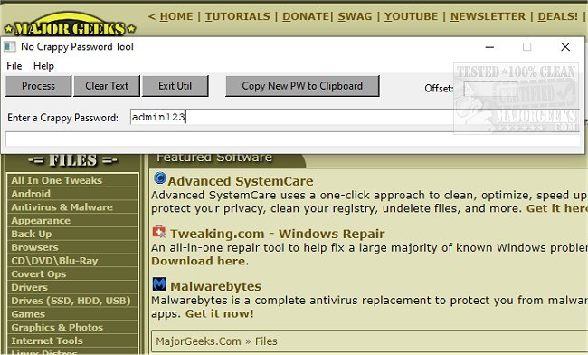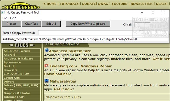 No Crappy Passwords works by hashing the crap out of your crappy password input producing an eighty-five-character password that can be easily copied to the clipboard.
