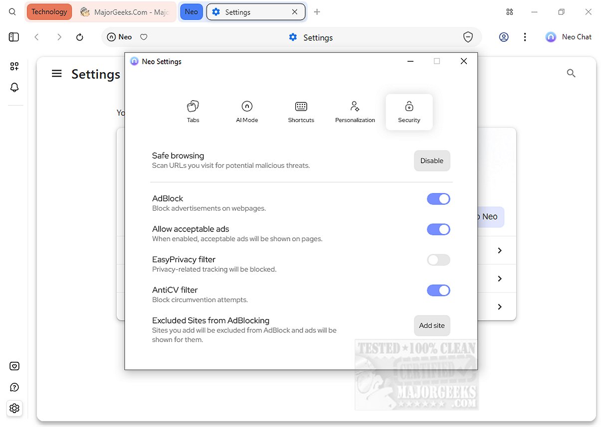 Additionally, Norton Neo includes the Norton Web Shield, which scans links for potential threats and phishing attempts. The built-in ad blocker, along with EasyPrivacy and the AntiCV filter, enhances user safety while browsing.