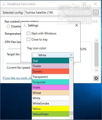 It comes with a powerful configuration system that allows you to adjust it to many different preloaded notebook models. All the available choices can be scrolled through via the corresponding drop-menu. NoteBook FanControl does have a few minor settings to choose from such as tray icon color selection, start with Windows, as well as an option to close to tray.