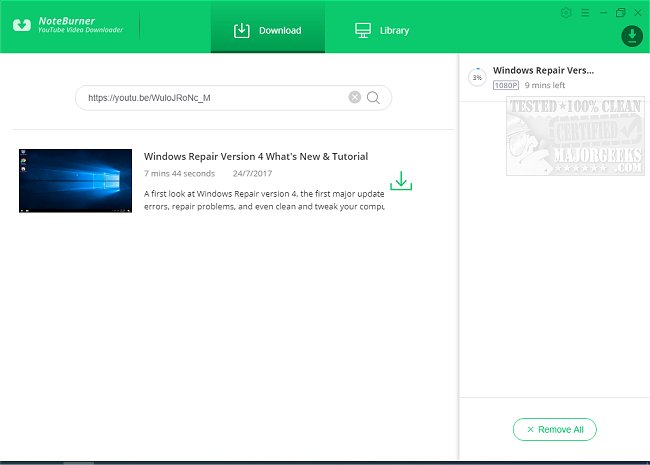Noteburner Youtube Video Downloader has a user-friendly and intuitive interface that is very easy to use. To download a video, you need to grab its URL, paste it into the app, and hit the download icon to the right. It then will download your selected video (times may vary depending on the size of the video). Having a YouTube video library at your fingertips allows you to save content for later viewing without directly accessing the YouTube site. Also, no more worrying about your slow internet connection causing buffering and other interruptions while streaming. And in the event your internet is out, you can still enjoy your favorite MajorGeeks videos by downloading them and saving them!