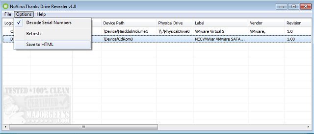 NoVirusThanks Drive Revealer will also permit you to decode physical serial numbers stored on the device as encoded hex. You then have the option to either convert this data to a printable ASCII (readable) or save the compiled data to an HTML report for later review. Much of this data can be gleaned directly from Windows via utilities like MSInfo32 or Device Manager, but the intention here was to offer some unique data that the aforementioned utilities do not include.