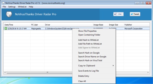 NoVirusThanks Driver Radar Pro is a serious time-saver for anyone investigating a possible infection by speeding up the time it takes to research a loaded file. The only thing missing is a portable version to take it with you.