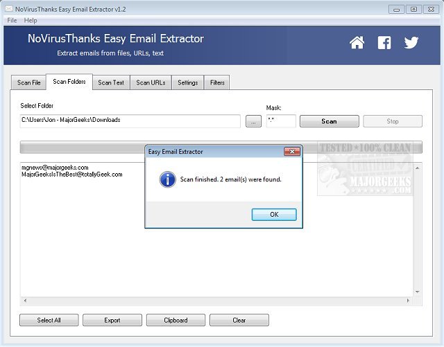 NoVirusThanks Easy Email Extractor allows email address extraction from your files, folders, and URLs.