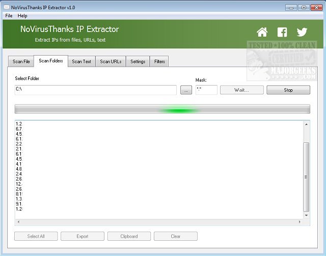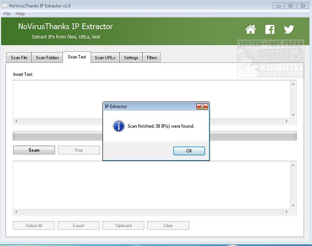 NoVirusThanks IP Extractor permits the extraction of IP addresses from files, folders, URLs, and text snippets.