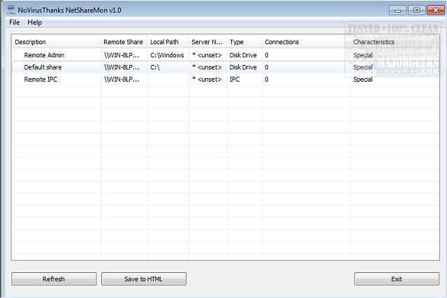 NoVirusThanks NetShareMon will be of particular interest to system administrators tasked with diagnosing shared network issues or for obtaining data from a host machine for analysis. It displays the server name (if set), remote share path, the local pathname of the share, the number of currently active connections on the shared resource, the type of shared resource and provides resource details (if available). All fields are listed from a minimalistic UI that requires no Administrative privileges or configuration to use. It allows the compiled data to be saved to HTML with a choice of a destination location for the report.