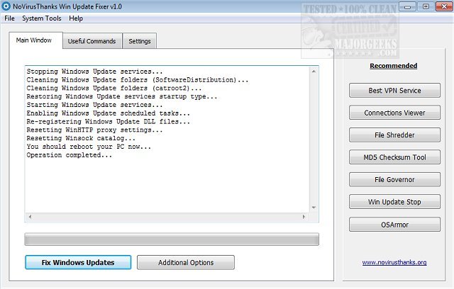 All you need to do is click the button 'Fix Windows Update' and then, once the operation has completed, reboot your machine. NoVirusThanks Win Update Fixer works by attempting to restore the essential Windows settings required for Windows Update to function correctly. It is nicely done, with an uncomplicated UI that stays focused on the specific job at hand. A few links within the interface lead to other free NoVirusThanks apps, but they are off to the side and relatively unobtrusive.