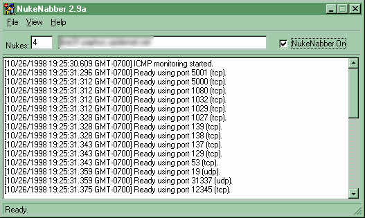NukeNabber sets itself up to listen on TCP and UDP ports commonly attacked over the internet. A total of 50 ports can be monitored simultaneously. ICMP dest_unreach attacks are now logged. It is designed to give you the information you need in order to trace an attacker including a method of finding an attacker's nickname on IRC (mIRC, VIRC and PIRCH clients are supported).