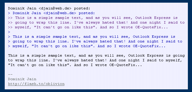 But the second feature is equally practical: OE-QuoteFix can instantly color quoted passages (according to the level of indentation), fix bad quoting and generally beautify messages as you view them in Outlook Express.