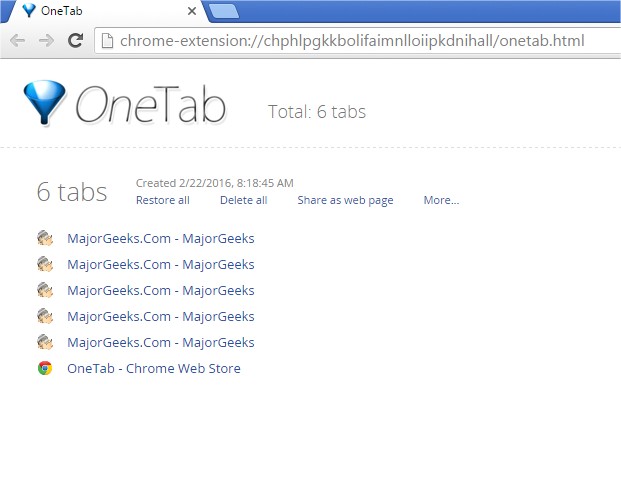 If you have too many tabs open, you can click on the OneTab icon, and it will immediately convert them to a handy list. Then when the need arises, you can quickly restore them one by one or all at once.