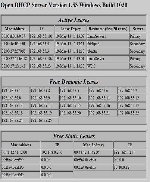 Additionally, two instances of Open DHCP Server can be installed, which work in load shared fail-safe mode. If one DHCP Server goes down, the other can still renew the leases issued by the failed server. The Databases of both servers will remain in sync, and there should never be any duplicate leases.