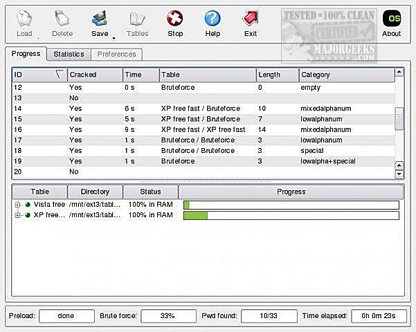 Ophcrack is a portable Windows password cracker based on a time-memory trade-off using rainbow tables. This is a variant of Hellman's original trade-off, with better performance. It recovers 99.9% of alphanumeric passwords in seconds.