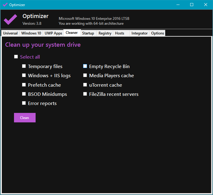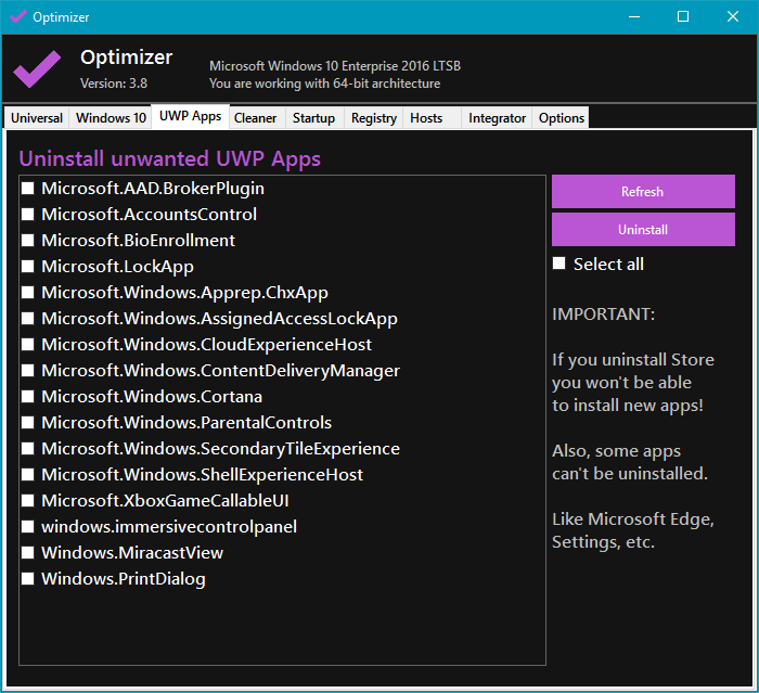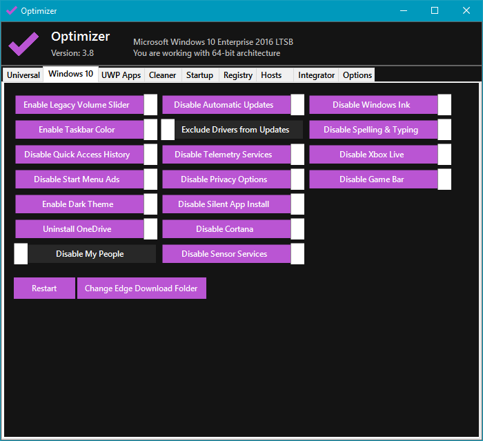 Optimizer is laid out with a series of tabs. These include Universal, Windows 10, Startup, Registry, Hosts, and Options. You will find (where there are no checkboxes) purple boxes with white text that turn into black text if applied. We didn't think we'd go for purple, but it works. Check under the options tab, and you will find your choice of 6 colors. In our screenshots, we changed the colors repeatedly during testing.
