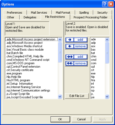 To use: Download the application and run the setup program. Then restart Outlook and select the options menu from the tools drop down. There will be a new tabbed labeled File restrictions. Use this interface to add/remove file types from the level 2 group.