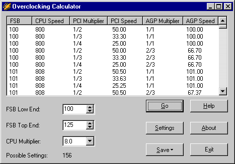 Overclocking Calculator calculates CPU speeds, PCI bus speed, and the AGP bus speed based on the information it is given to work with.