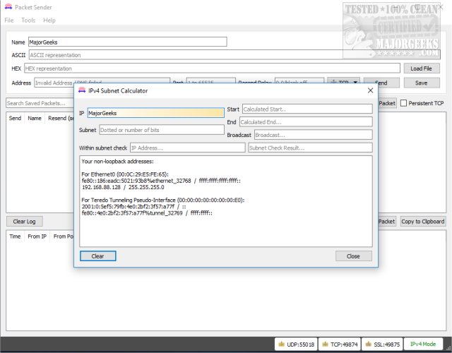 The interface is relatively easy to use, especially for networking geeks, but it seems simple enough to use at any skill level. Available fields include Packet Name, ASCII Representation, HEX Representation, Address (IPv4, v6, DNS lookup), Port, Resend Delay, and quite a bit more. An information window is available below that, and the third window with a log of activity.