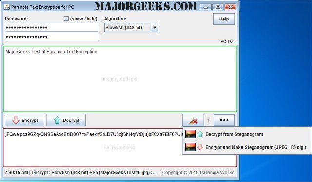 Paranoia Text Encryption for PC comes with a user-friendly UI that allows for quick copy/paste from any of your favorite apps, or you can save the encryption to a file to use at a later time. It also includes a steganography implementation that can conceal text within a JPG image using steganographic algorithm F5 in concert with chosen symmetric cipher algorithms to make a final steganogram (JPEG image).