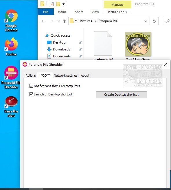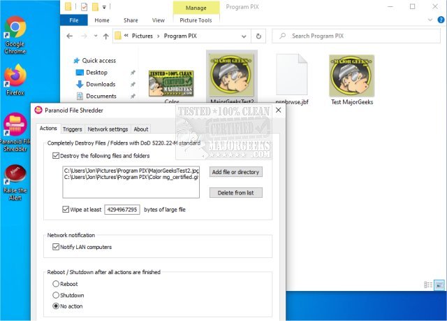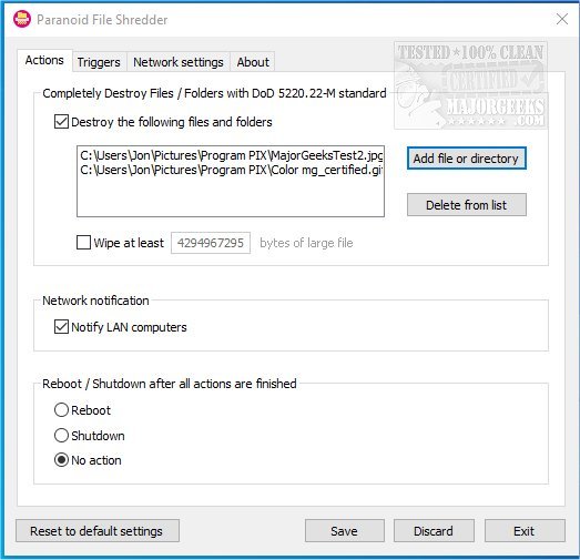 The above events mean that when it's needed, you can trigger the shredding action remotely from any LAN computer. And all of them will shred configured files/folders and notify any connected networks also. When an alert is raised, Paranoid File Shredder removes files using the DoD 5220-22.M data erasing standard. You can also set it to reboot, shutdown, or no action upon completion of the shredding. There is additionally the ability to 'Raise the alert' manually via a provided desktop shortcut.