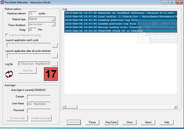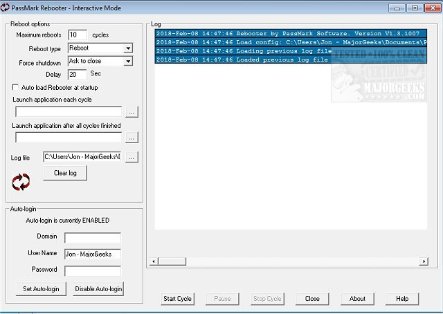 PassMark Rebooter can also be used to auto-launch all your third-party applications, and they can be scheduled to launch per cycle or after all cycles are completed. You also have the option to enter your PC login details allowing it to log you in upon restart. It will create a log file so that even if you step away during a cycle, you will still have access to all the details. Everything with this portable utility is wrapped up nicely in an easy-to-navigate UI, but if you happen to get stumped, there is an included help file with the software.