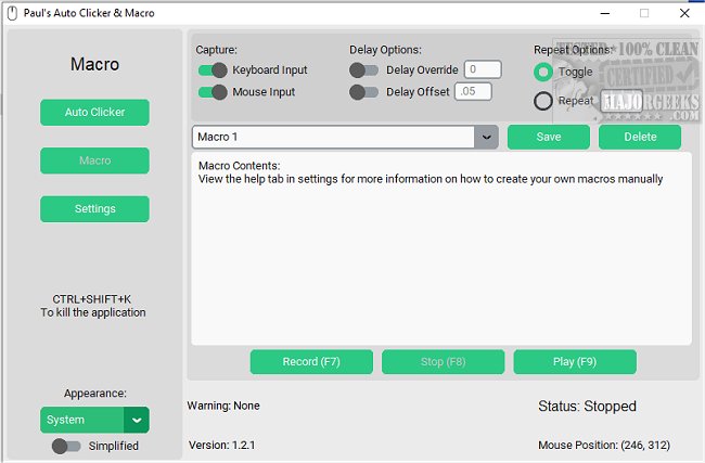 Paul's Auto Clicker & Macro is a program that offers a user-friendly GUI, a kill switch, and a customized click interval clicker with randomized offsets for the mouse position. It also allows you to use the left, right, and middle mouse buttons and select cursor positions. You can repeat actions until stopped or a given number of times, record and save macros, and play them back with options to capture mouse and/or keyboard inputs. Additionally, you can write custom macro scripts, restrict the program to specific windows, and create custom hotkeys to control the program.