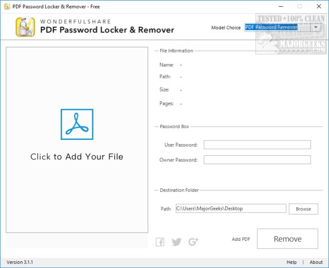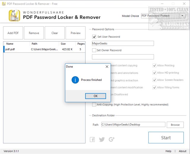 The interface has a drop-down tab to the top right that opens PDF Password Protect or PDF Password Remover. You can drag-and-drop your PDF into the application or click on "Add PDF." Password options are numerous. However, if you like simplicity then select "Set User Password, " but you can also set the owner password as well. Some of the many other options, most already selected, include allowing comments, copying, text and graphics extraction, printing, and more. It's well thought out allowing your PDF to be as accessible as you like. Optionally, you can also choose the saved folder. Once completed you will find your PDF with the words _locked at the end.