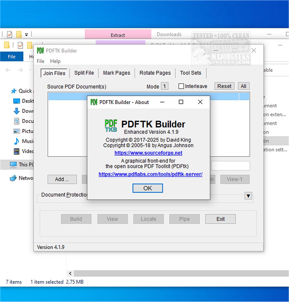 PDFTK Builder "Enhanced" is a free and Open Source graphical user interface (GUI) application designed for manipulating PDF files through the Windows version of PDF Toolkit (PDFtk). This versatile tool allows users to perform various tasks such as splitting, merging, stamping, numbering pages, rotating, and managing metadata, bookmarks, and attachments.