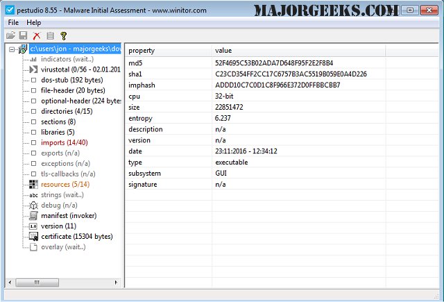PeStudio is a portable tool that performs malware assessments on executable files. Since the target file is never launched during the investigation, you can safely evaluate the file, in addition to malware, without risk.