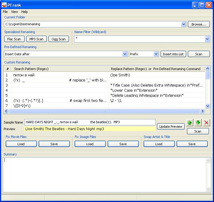 PFrank is an acronym for Peter's Flexible RenamiNg Kit. This is a Freeware bulk file renaming program that runs under Windows. With this tool you can easily organize your music files, picture files, or any other types of files. PFrank comes equipped with many features, some of which you won't find on any other renaming program. The beauty of this tool is it's flexibility. You can easily build any renaming command sequence you like, preview all of the results, press the rename button, and you're done.