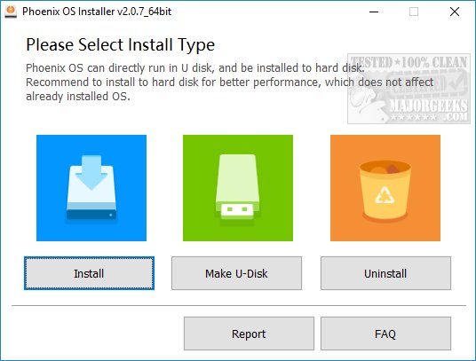 During installation, you are given the option of your hard drive or to a USB thumb drive. It is best for performance to install it to your hard disk. There are also options to report a problem if you got an error message already and a FAQ if you have any questions before you begin. Next, you choose the drive to install Phoenix OS on, and they let you know that it won't delete any files. You can opt to use 4, 8, 16, or 32GB of drive space but make note you can't change this later so go big. If you're upgrading later, you will see the same screens we just discussed except for upgrade, rather than install. Finally, you can reboot and select Phoenix OS on boot. We've taken screenshots of all this you can see below as we know it can be a little intimidating for some.