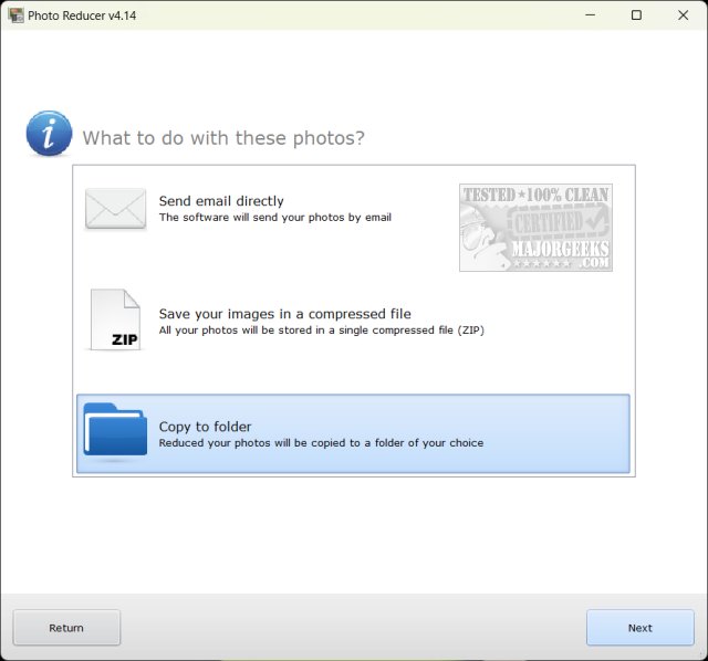 Once you've made your selection, click Next. You can email the file, save it as a compressed (zip), or copy it to a local folder. Photo Reducer will resize the photo while preserving the original image.