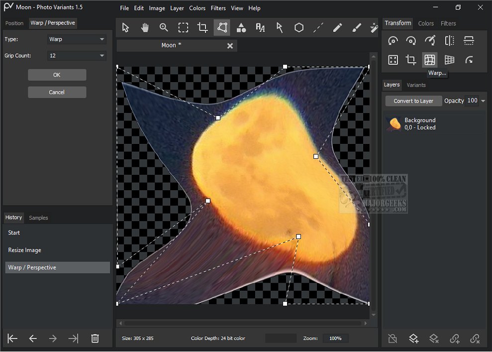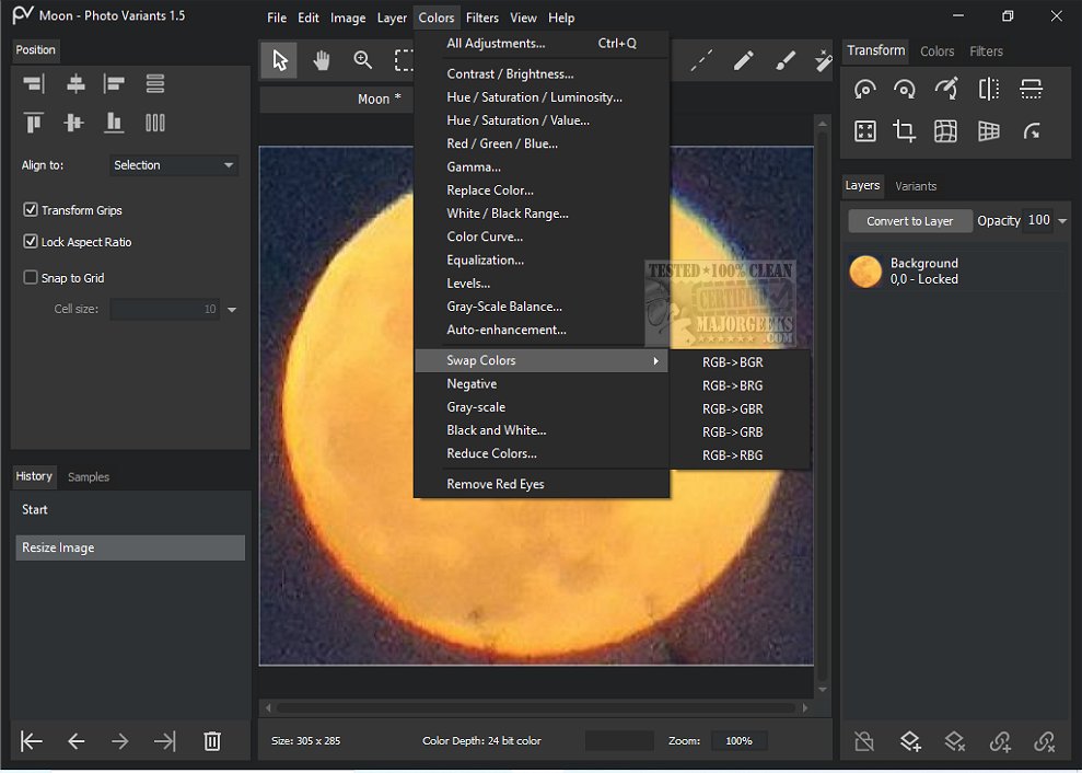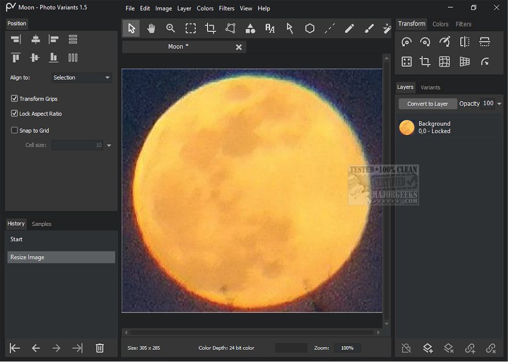Photo Variants showcases a well-thought-out design that balances functionality with simplicity. Its streamlined layout ensures that users can access a wide range of image-processing features without feeling overwhelmed by complexity or clutter. It features a comprehensive toolbar, along with dedicated panels that facilitate layer management and editing history. Additionally, it provides separate tools designed specifically for image geometry transformation, color adjustments, and the application of filters.