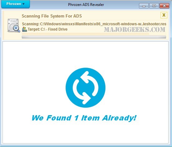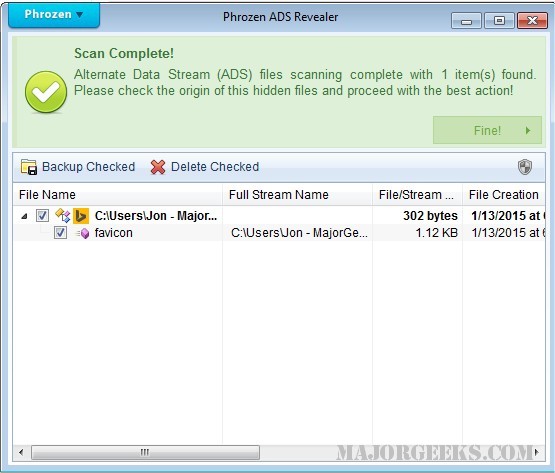 Phrozen ADS (Alternate Data Stream) Revealer quickly scans for likely malicious ADS files in your file system, it then allows you to make a determination to keep or delete the item.