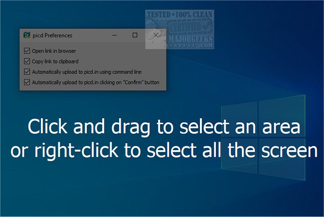 picd is perfect for those that wish to share images instantly online for whatever reason. Whether it is the full desktop, an area, window, or error message picd has you covered. It is a modern and handy service to share images and screenshots. picd is connected with the picd.in service, so you will only need seconds to share your screenshots online. It has a straightforward interface so you can perform the job efficiently. Once you have grabbed your shot, it will take you through the process and create a custom link to the image. This link can then be shared.