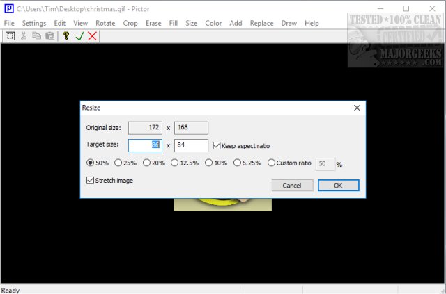 We like the file menu setup because you can find what it is you want to do and then work your way into getting that photo just right. There are so many ways this works; we'll only use an example. Let's say you know you want to resize your photo. There's a Size option in the menu, and when it expands, you are given the choice of "Resize and stretch image" or "Resize image without stretching." Once you select this, your options appear. You are shown the original size, target size, maintain aspect ratio, or choose a percentage or custom ratio. You're also given a choice to stretch or not stretch the image if you changed your mind.