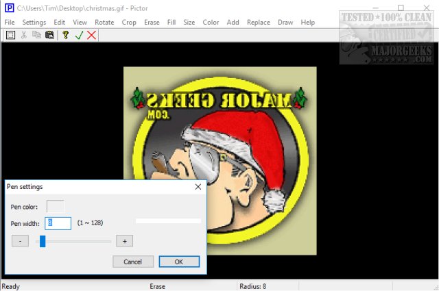 You can add a photo via the File menu or by drag-and-drop. Once loaded, you will find the File menu has easy-to-understand categories. These are Settings, Edit, View, Rotate, Crop, Erase, Fill, Size, Color, Add, Replace, Draw, and Help.