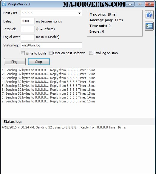 Ping4Win is the perfect tool for any skill level, from novices that may not be well versed in using the command prompt all the way up to advanced users just looking for a quick and different way to ping addresses.