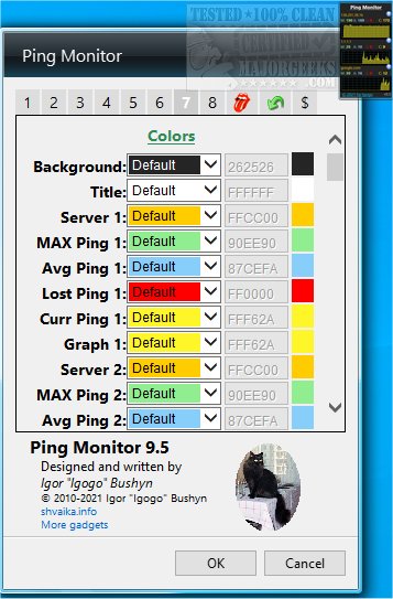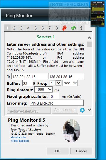 Ping Monitor will ping each one of your selected servers at a user-defined interval. The returned response will be shown in a graph and number form. You are given a decent amount of info like the maximum, average, and current ping time. Ping Monito also displays the number of errors while pinging the server or IP address. Additionally, for each server, you have the option to store the results in a log file.