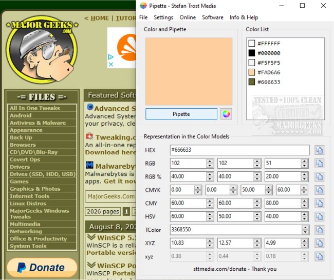 Pipette is designed to automatically save the target color within its color list, allowing you access to them upon the next start-up. To use, Pipette, hit the button called... Pipette, this gives you a crosshair cursor. Once you click your chosen color, the values are propagated in their respective fields. There are some includes out links to other software from the author and also color charts.